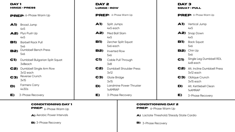 Balanced Full-Body Hybrid Training: 3 strength sessions plus 2 conditioning sessions each week develop strength, power, and athleticism while enhancing endurance and energy.